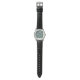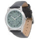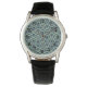This men's watch has a geometric design of circles in rows with circles or ovals inside in blue on a field of green.