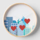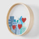 Be inspired with the cartoon clock design of a city view of modern tall buildings.