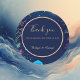 Elevate your coastal celebration with our customisable round sticker, a perfect addition to your special day. Inspired by the soothing blue hues of the ocean and the serene coastal vibes, this thank you label sets the tone for an unforgettable experience. Adorned with elegant seashells and marine animal motifs, along with vibrant generative artwork inspired by the coast, it adds a touch of sophistication to any packaging. Personalise with your monogram or name and wedding thank you text for a truly unique touch.