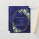 A navy blue, uneven coloured background decorated with cones, white berries and greenry. A faux gold oval frame. Personalise and add the details.