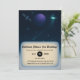 Stylised outer space invitation design featuring a glowing blue cone-shaped UFO, a dark violet planet, satellite, and twinkling stars in a gradient galaxy sky. The lower section contains editable event text framed in a glowing card panel, ideal for futuristic parties or alien-themed birthdays.