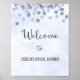 Poster print for welcome sign with blue confetti design and pastel blue watercolor background.