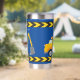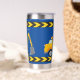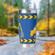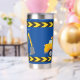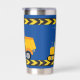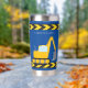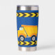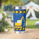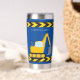 Cool custom construction excavator tumbler gift for a child who loves yellow construction vehicles in blue, black and yellow. Fun vehicle gift for a little boy who loves cars and trucks. Customise with your kid's name under the black and yellow caution tape. The back features a dump truck.