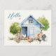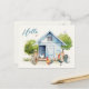 Postcard with chicken coop and optional printed message and address. Large "hello" text on the front is printed in the upper left corner over a cute, blue chicken coop design. Summer green trees poke from behind the chicken's house, with chickens and rooster in the yard.Perfect for keeping in touch with friends, customise with a personal message on the back. Also add a mailing address to the template provided, or delete the sample wording to order blank.