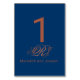 This elegant table number has an intertwined monogram in script font in shades of copper and copper text on a blue background.