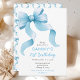 This cute and whimsical birthday party invitation features a watercolor blue coquette bow. The text combines handwritten script and serif fonts for a stylish and modern look.