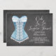 Ooh La La Lingerie Bridal Shower Invitation featuring a lacy blue & White corset set on a popular chalkboard background with a coordinating back