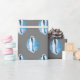 Gift wrap featuring watercolor blue cowrie seashells pattern on medium grey background