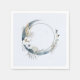 Paper napkins with a mystical illustration. A dark blue crescent moon with a elegant thin circle outline and white flower blossoms along its edges.