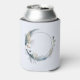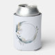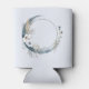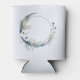 A can cooler with a mystical illustration. A dark blue crescent moon with a elegant thin circle outline and white flower blossoms along its edges.