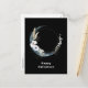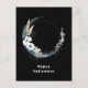 Halloween postcard with a mystical illustration. A dark blue crescent moon with a elegant thin circle outline and white flower blossoms along its edges