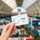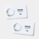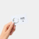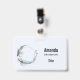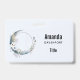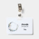 Name tag with a mystical illustration. A dark blue crescent moon with a elegant thin circle outline and white flower blossoms along its edges.