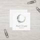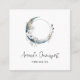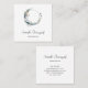 Square business card with a mystical illustration. A dark blue crescent moon with a elegant thin circle outline and white flower blossoms along its edges.