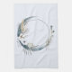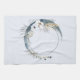 A kitchen towel with a mystical illustration. A dark blue crescent moon with a elegant thin circle outline and white flower blossoms along its edges.