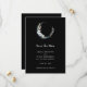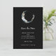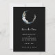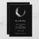 Save the date card with a mystical illustration. A dark blue crescent moon with a elegant thin circle outline and white flower blossoms along its edges.