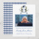 Blue Crest Baby Boy Photo Birth Announcement Card. Blue harlequin diamond pattern on back can be deleted. Blue floral greenery monogram crest on front.