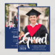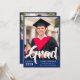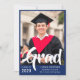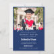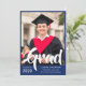 A graduation announcement and graduation party invitation in one! Show off your graduate's achievement with this bold typography graduation announcement with their photo in the spotlight, with Grad written in a bold white script in a modern style across the bottom of the photo. Personalize the custom text with the year, your graduate's name, the school they graduated from, and the degree they've gotten. Add the graduation celebration invite on the back of the card, beneath a second photo of the graduate. He did it! is written across the second photo, but as the text is editable, you can change it to She did it or They did it, depending on the pronoun of the graduate. The text is a stark white against a blue background.
