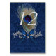 Elegant wedding reception table number card, with graphics of a blue on blue damask background, with a silver tone flourish, a blue satin looking bow, and a peacock feather. Personalise the light grey number for each table at your reception. Matching products available.