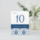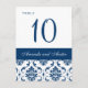Beautiful White and Navy Blue Damask Wedding Table Number Cards. Order one per table number. Edit using the "customise it" option to change the number and then add to cart. Select to file you just made and customise again with next table number and so on. Continue so that the number of single postcards with each different number in your cart are equal to your table numbers.