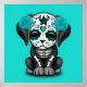 This adorable design features a small baby puppy decorated with Day of the Dead Sugar Skull patterns. A single rose appears on the puppy’s head with a five point star sitting in the middle of it’s forehead. The tiny animal is decorated with swirls and dot patterns in the tradition of the Day of the Dead Sugar Skulls. This unique puppy design is an adorable way to celebrate the Day of the Dead.
