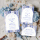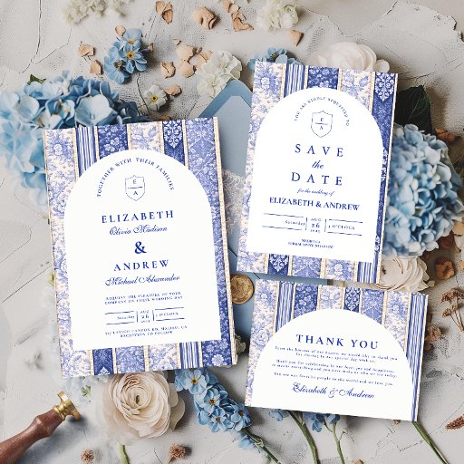 A timeless blue and white design inspired by classic Delft porcelain and French toile patterns. The patchwork tile border combines delicate florals, stripes, and ornamental motifs that evoke vintage European ceramics. A soft arched panel in the centre keeps the layout refined and elegant while allowing the details of the porcelain-inspired pattern to frame the celebration beautifully. Perfect for couples planning a sophisticated blue and white wedding with traditional European charm.