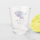 Purple and turquoise blue Dendrobium orchid personalised shot glass. Simple wedding shot glass design that features a beautiful orchid variety called a blue dendrobium. It is teal / turquoise in colour paired with violet and royal purple. A great flower choice for peacock wedding colour theme. You can personalise the bride and groom's names and wedding date.