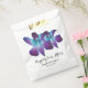 Purple and turquoise blue Dendrobium orchid personalised wedding favour bags. Simple wedding favour bag design that features a beautiful orchid variety called a blue dendrobium. It is teal / turquoise in colour paired with violet and royal purple. A great flower choice for peacock bridal shower colour theme. You can personalise the bride and groom's names and wedding date.
