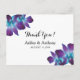 Purple and turquoise blue Dendrobium orchid wedding thank you postcard. Simple wedding thank you postcard design that features a beautiful orchid variety called a blue dendrobium. It is teal / turquoise in colour paired with violet and royal purple. A great flower choice for peacock wedding colour theme.