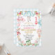 Sweet Alice in one-derland birthday invitation featuring various items from the story on a blue diamond background. The design also includes a red heart and and the number one and a this way that way banner. This Alice in wonderland birthday invitation also features a some faux gold foil text image that are removable.