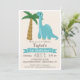 Blue dino and palm tree, prehistoric dinosaur theme neutral, boy or girl birthday party invitation. Personalise this cute, retro feel invite with your child's name. Cute, simple, plain design. Perfect for baby's first, 1st, birthday, toddler, young children, or older kids. Colours include green, aqua blue and brown.