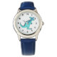 This wrist watch has a cute blue colour cartoon dinosaur illustration. It is a fun cartoony design suitable for all.