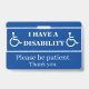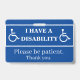 Blue Badge. I have a disability. Please be patent. Alert others to unseen disabilities. Give this to dad, brother, grandpa, friend, child, more. They can wear in public to let everyone know they may need a little more time than others. Personalise, Erase the back and add your own words. Can add a name, emergency phone number, or alert for illness or condition. Choose edit. Thoughtful gift.