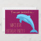 A cute fully customisable birthday invitation suitable for a young child, young girl or tween girl. This cute design is for a girl's party and has a picture of a blue cartoon dolphin illustration against a dark purple background - the background colour is customisable.