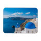 Beautiful photograph of the iconic blue church domes of Aghioi Theodoroi (Saints Theodore) that can be seen along the cliffside of Santorini Island, Greece.