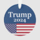 This decorative Donald Trump 2024 presidential campaign Christmas ornament features a navy blue background with the phrase "Trump 2024" printed in white, classic font. The bottom features an image of the American flag. The same image appears on both sides of the ornament.