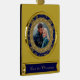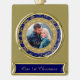 This holiday keepsake ornament features your own photograph within a pretty frame of gold glittery snowflakes on a royal blue background. A second circular frame in a gold ornate pattern makes it unique and special. The bottom portion has your custom text in gold on a blue background. Beautiful for those newlyweds!