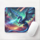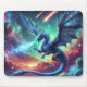 A mystical blue dragon flies through a vibrant cosmic sky, surrounded by stardust, snowflakes, and shooting stars.