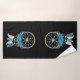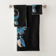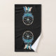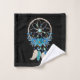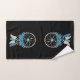 Towel set with a pretty watercolor dreamcatcher. Blue, turquoise and cream colours. Decorated with feathers, beads and flowers. Black background.