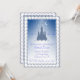 A magical dreamy blue colour glowing castle with towers and flags flying up in the soft light blue clouds under a starry sky and crescent moon. Custom text on the front contains date, time, name, address, and RSVP information for a prince birthday. Text on the back says, "Once upon a time, a prince turned 6" with custom age under a crown for a boy. An original digital art design.