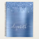 Custom elegant and girly planner featuring blue faux glitter dripping against a rose gold faux brushed metallic background. Personalise with your name in a stylish trendy white script with swashes.