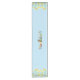 Pretty table runner for celebrating Easter or the Spring season. Sky blue background with daffodils and crocuses decorating both ends. A fun spring border with bunnies, chicks, eggs and more in the centre.