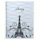 Jot down important notes or reminders with a Blue Eiffel Tower Flourish Notebook. Notebook design features the Eiffel Tower adorned with elegant flourishes against a blue wavy background. Additional colours available with this design as well. This item may be personalised with a name or monogram of your choosing. Please contact me if you need assistance with personalisation.