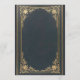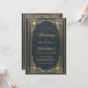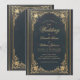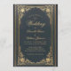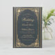 This elegant wedding invitation with a vintage air, recommended for a more formal, "black tie" wedding, has a vintage golden frame with elegant baroque gold decorations on a dark blue leather-like background. The names of the bride and groom and the word Wedding are written in an elegant calligraphic script. All text can be personalised and has a golden colour similar to the vintage golden frame.