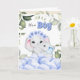 A beautiful illustration of a cute cartoon mother elephant with pink ears clutching her calf to her chest. She has beautiful blue anemone watercolor flowers on her head and is sitting in a blue bouquet of petal leaves framed by a faux gold and eucalyptus leaf frame. The little baby has cute little blue ears and is hugging his moms chest. The words, it's a boy, appears on a white background and the inside has a template for your personalised message.