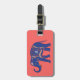 Stylish coral coloured luggage tag with graphics of a blue elephant with colourful flower accents. The back of the tag has blue custom text ready to personalise.