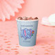 Cute cartoon blue baby elephant with pink flower over blue background with white sparks