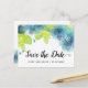 Handwritten script calligraphy and blue ethereal flowers floral spring wedding Save the Date postcard. The upper part is covered with lovely blue flowers and green leaves.