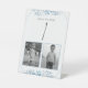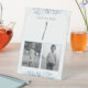 Elegant, boho wedding table number pedestal sign features a modern geometric border and dusty blue eucalyptus leaves. The table number corresponds to the age of the couple and features black and white photos of them at that age. Create as many table numbers as you need by changing the "1" to your desired number, swapping the photos for your own, and add 1 item to your cart. Repeat for as many table numbers needed with the easy to edit template. Check out matching items in the “Blue Eucalyptus” collection.