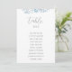 Elegant, boho seating chart card by table features dusty blue eucalyptus leaves. Personalise with your guest's names and table numbers with the easy to edit template featuring a romantic script font and modern sans serif font.