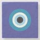 Blue stone coaster with bold evil eye graphic and cork back.